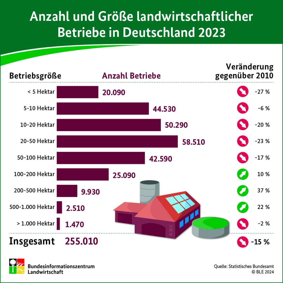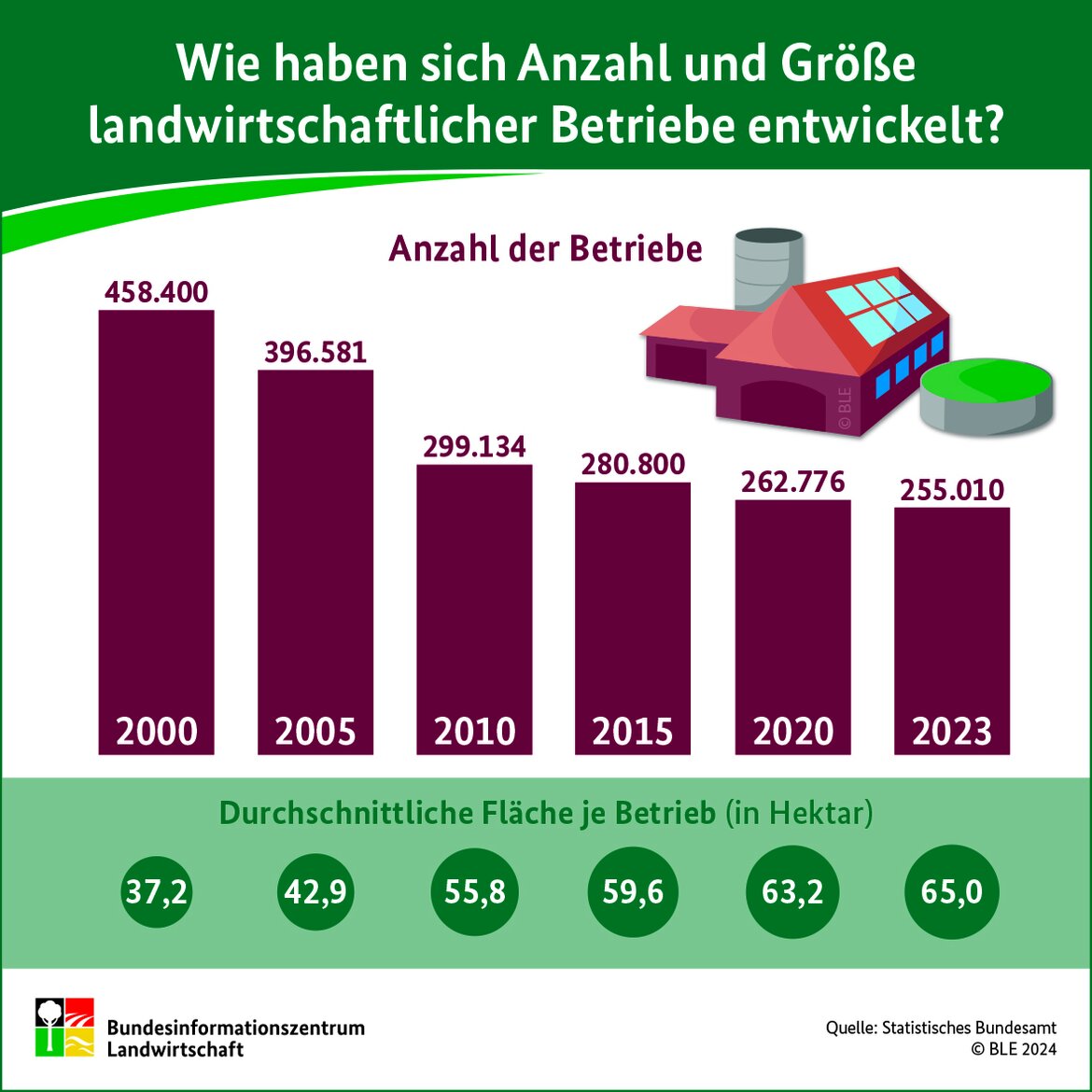 Rund 255.000 landwirtschaftliche Betriebe gab es 2023. Seit der Jahrtausendwende ist die Anzahl landwirtschaftlicher Betriebe damit um fast 45 Prozent gesunken. Seit 2010 hat sich der Strukturwandel in der Landwirtschaft zwar etwas verlangsamt, er schreitet dennoch weiter voran.