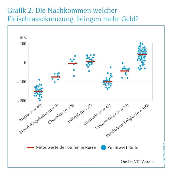 Dargestellt sind die Zuchtwerte der BoD-Bullen nach Rassen. Dabei zeigen sich sowohl markante Unterschiede zwischen als auch innerhalb der einzelnen Rassen. Da die meisten BoD-Basisbullen Kreuzungen mit Weißblaue Belgiern sind, schneiden andere Rassen im Vergleich oft schlechter ab. Wer beispielsweise einen Angus-Bullen für BoD einsetzen möchte, sollte dessen Zuchtwerte im Vergleich zum Durchschnitt der Rasse betrachten: Dieser liegt bei –153 €. Im Vergleich gibt es jedoch deutlich bessere Bullen der Rasse Angus als im Beispiel, die besonders interessant für den Einsatz sind.