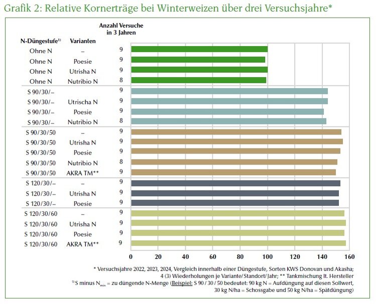 Interessant sind abzuleitende Aussagen zur optimalen Höhe der N-Düngung für den jeweiligen Standort. Diese haben allerdings nichts mit der eigentlichen Versuchsfrage zu tun und sollen hier außen vor gelassen werden. Auch wurde die Wirkung in anderen Kulturen in den Versuchen nicht ausreichend geprüft.