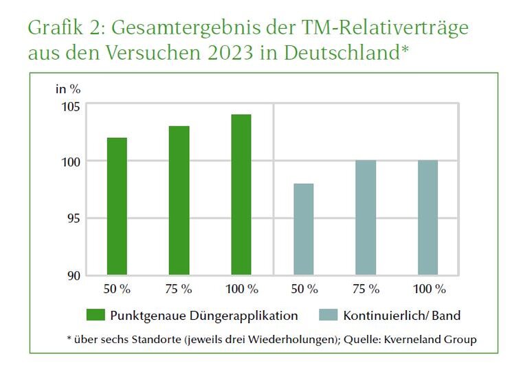 Großflächenversuche. Nachdem die Technik in eine praxisreife Einzelkornsämaschine integriert wurde, hat Kverneland im Jahr 2023 auf über 20 Standorten in Europa weitere Großflächenversuche initiiert. Die Versuchsplanung und -durchführung erfolgte mit lokalen Partnern des Feldversuchswesens. Jeder Einzelversuch umfasste mehrere Hektar. In Deutschland wurden auf sechs Standorten Versuche angelegt und ausgewertet, darunter fünf als Silo- und einer als Körnermais. An jedem Standort wurde die punktuelle Platzierung mit der klassischen Bandapplikation in jeweils drei Aufwandmengen (50, 75 und 100 %) und im Mittel drei Wiederholungen verglichen. Wie bei den vorausgegangen Exaktversuchen diente auch hier die klassische Bandapplikation mit 100 % Aufwandmenge als Referenz. Die Aussaat
