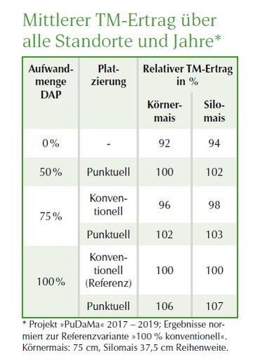 drei Versuchsjahre (Übersicht). Der Einfluss der verschiedenen Düngevarianten auf die Ertragsbildung ist deutlich erkennbar. Besonders fällt das Ertragsniveau der punktuell gedüngten Varianten im Vergleich zu den konventionellen Varianten auf. Im direkten Vergleich der gedüngten Varianten mit 100 % Aufwandmenge zeigte sich im TM-Kornertrag ein Vorteil von 6 % und im TM-Silomaisertrag von 7 % durch die punktuelle Platzierung. Diese Unterschiede sind signifikant, sodass ein Mehrertrag durch die punktuelle Applikation bei gleicher Aufwandmenge im Rahmen dieser Exaktversuche bestätigt werden konnte. Zwischen den untersuchten Reihenweiten von 37,5 und 75 cm gab es keinen signifikanten Unterschied. Die punktuelle Unterfußdüngung hat sich hier gleichermaßen positiv ausgewirkt.