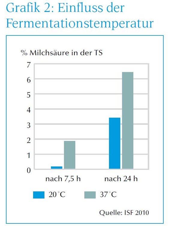Auf die richtige Temperatur kommt es an! Die für die Fermentation von Schweinefutter geeigneten Bakterienkulturen mögen es wesentlich wärmer als in früheren Jahren gedacht. Zunächst wurde bei Zimmertemperatur von etwa 22 °C fermentiert. Wissenschaftliche Untersuchungen haben aber gezeigt, dass bei 36 bis 40 °C deutlich bessere Leistungen erzielt werden können. So ist es möglich, den Futterbrei innerhalb von 24 Stunden auf einen pH-Wert von unter 4 zu bringen. Durch eine Temperaturerhöhung von 20 auf 37 °C verdoppelt sich nach 24-stündiger Fermentation der Milchsäuregehalt im Ferment nahezu (Grafik 2). Eine Verlängerung der Fermentationsphase bringt keinen deutlichen Abfall des pH-Wertes mehr. Folglich lautet die aktuelle Empfehlung zur Fermentation von Schweinefutter: 24 h bei 36 bis 40 °C. Besonders begünstigt sind Betriebe, die eine Biogasanlage haben und damit auf äußerst sinnvolle Weise ihre erzeugte Wärme nutzen können, um das nötige Prozesswasser auf 40 °C aufzuheizen.