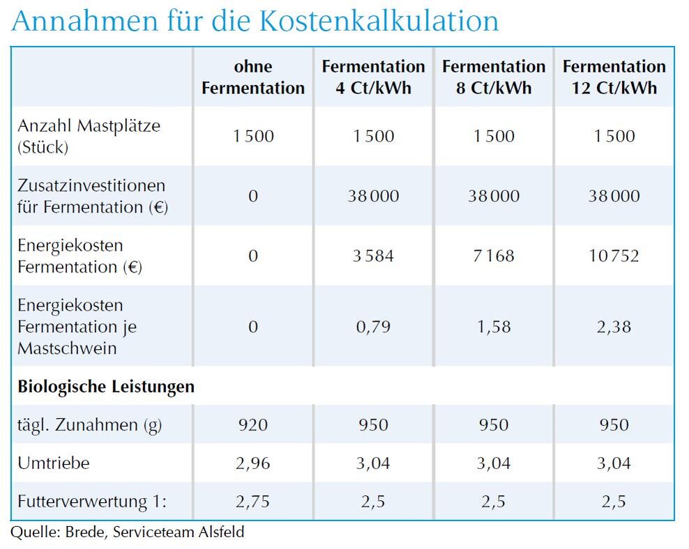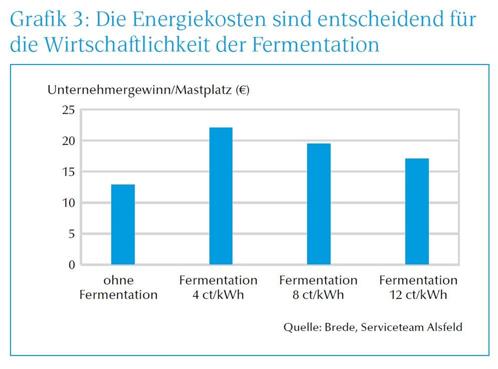 Höherer Unternehmensgewinn durch Fermentation. Berechnungen von Wilfried Brede vom Serviceteam Alsfeld zeigen auch die wirtschaftlichen Vorteile der Fermentierung von Schweinefutter. Unter der Annahme, dass die in Feldversuchen gezeigten Verbesserungen der Tageszunahme (+ 30 g), des Futteraufwandes (– 0,25 kg/kg) und der Tierverluste (– 2 %) eintreffen, ermittelt er für einen Stall mit 1 500 Mastplätzen höhere Unternehmensgewinne von 5 bis 9 €/Mastplatz (Grafik 3). Die Varianz ergibt sich aus den angesetzten Kosten für Energie (Übersicht), die zur Erwärmung des Prozesswassers benötigt wird. Gerechnet wurden Varianten mit 4, 8 und 12 Ct/kWh. Zugrunde gelegt wurden Investitionskosten für die Anlage (Fermentationstanks plus Zuleitungen) von 38 000 €. Dabei galt die Annahme einer bereits vorhandenen Flüssigfütterung. Für die Bakterienmischungen wurden Kosten von 50 Ct/Mastschwein angesetzt sowie etwas höherer Arbeitskosten bei Anwendung der Fermentation.