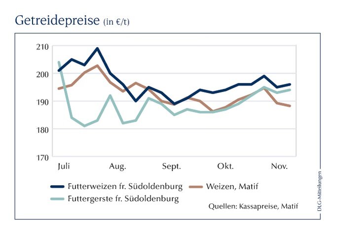 Eine zarte Hoffnung zeigte sich Anfang November auf dem Weizenmarkt. Getrieben von Nachkäufen der Futtermühlen konnten sich die Preise etwas erholen. Hinzu kamen Impulse von der Börse: Nach der Ankündigung der Chinesen, US-amerikanischen Weizen kaufen zu wollen, lösten die Fonds einen Teil ihrer Leerverkäufe auf, was zu merklich steigenden Kursen in Chicago führte (+ 18 US-$/t) und auch an der Matif spürbar war – mit einem Plus von 9 €/t. Und nicht zuletzt der US-Dollar spielte mit. Der Wechselkurs zum Euro fiel von