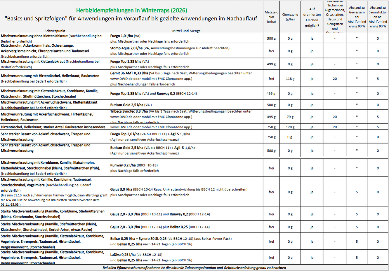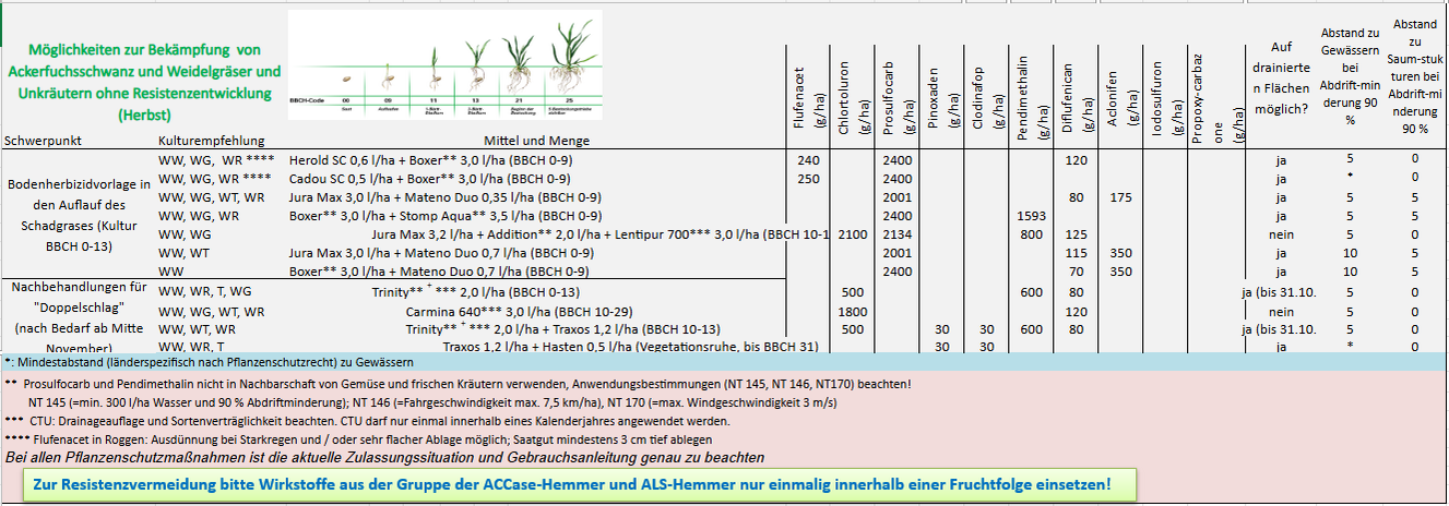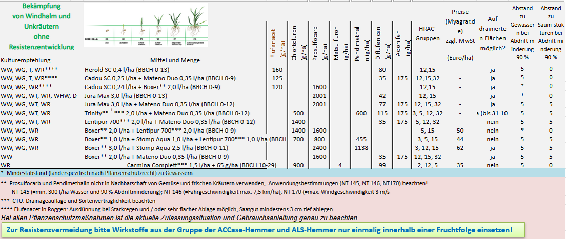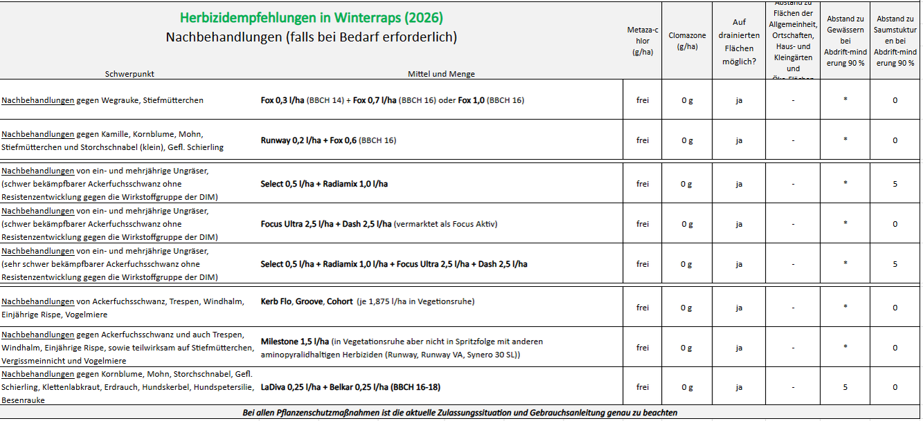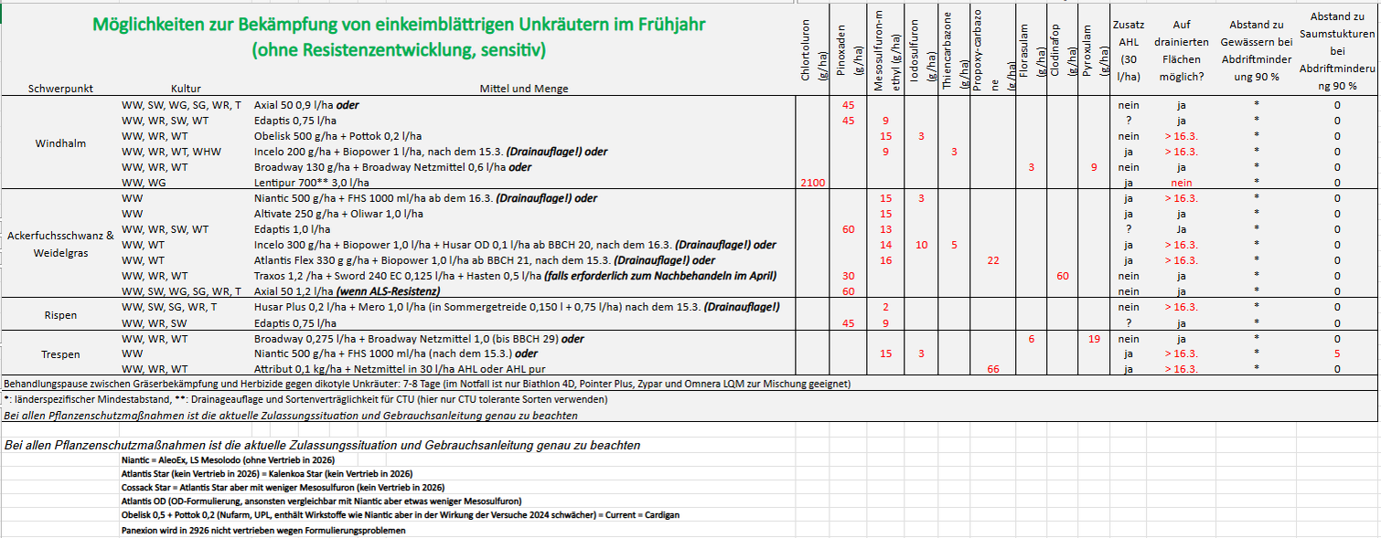 Bereits heute sind wichtige Herbizidwirkstoffe wie Flufenacet oder Metribuzin weggefallen. Weitere Substanzen wie Imazamox, Propyzamid, Lenacil, Diflufenican, Aclonifen, Sulcotrione, Tembotrione, Pendimethalin und weitere könnten folgen. Andere Wirkstoffe werden die Lücken füllen müssen und für die Empfehlungen 2026 wichtiger werden – wie Prosulfocarb oder Dimethenamid zur Schadgräserbekämpfung.