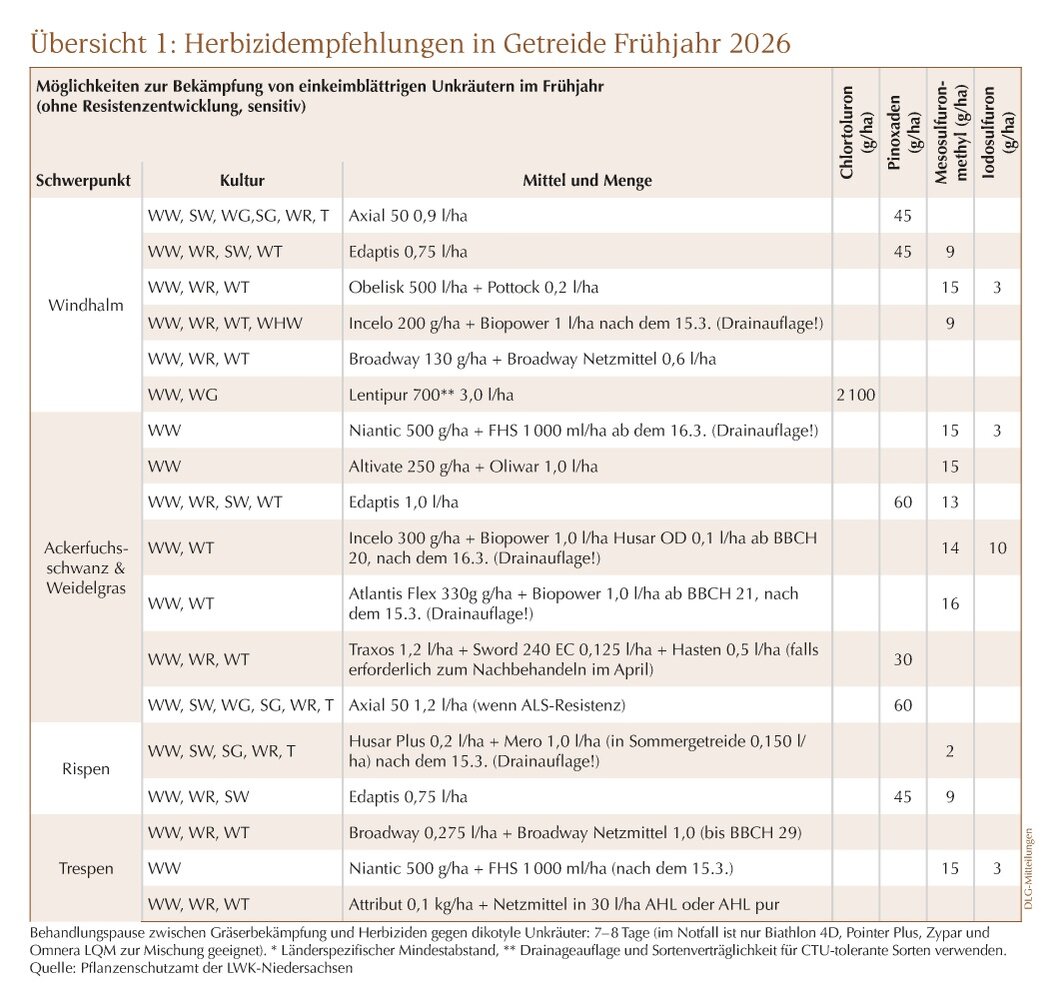 Für den Frühjahrseinsatz hat sich der Herbizidmarkt kaum verändert. Gegen sensitive Ungräser stehen inzwischen mehrere generische, mesosulfuronhaltige Produkte zur Verfügung. Die bekannten Mittel Atlantis Flex und Niantic werden – wie bereits zuvor – durch Altivate ergänzt und 2026 durch die neuen Produkte Obelisk und Edaptis erweitert. Edaptis enthält zusätzlich den Wirkstoff Pinoxaden.