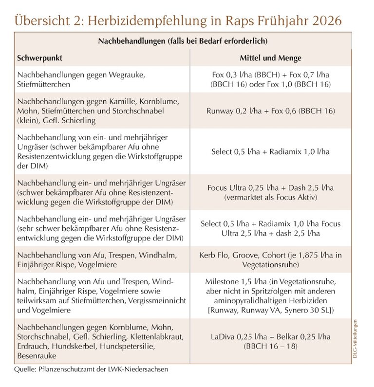 Im Frühjahr lassen sich im Raps Problemunkräuter wie Mohn, Kornblume, Hundskerbel, Ochsenzunge und Ackerkrummhals meist nur dann zuverlässig bekämpfen, wenn im Vorauflauf mit Clomazone und in Wasserschutzgebieten mit reduzierten Metazachlor-Mengen gearbeitet wurde und anschließend gezielte Spritzfolgen zum Einsatz kommen. In unseren Versuchen haben sich im Nachauflauf vor allem die Kombinationen Runway plus Fox oder Effigo plus Fox in Spritzfolge mit Milestone bewährt; besonders Milestone bietet eine sehr gute Absicherung gegen Kamille, Klatschmohn, Kornblume und Stiefmütterchen. Auch eine Kombination aus Milestone und Fox ist denkbar und eignet sich, um eigene Erfahrungen zu sammeln, während Spritzfolgen aus Runway und Milestone aus Zulassungsgründen nicht möglich sind.