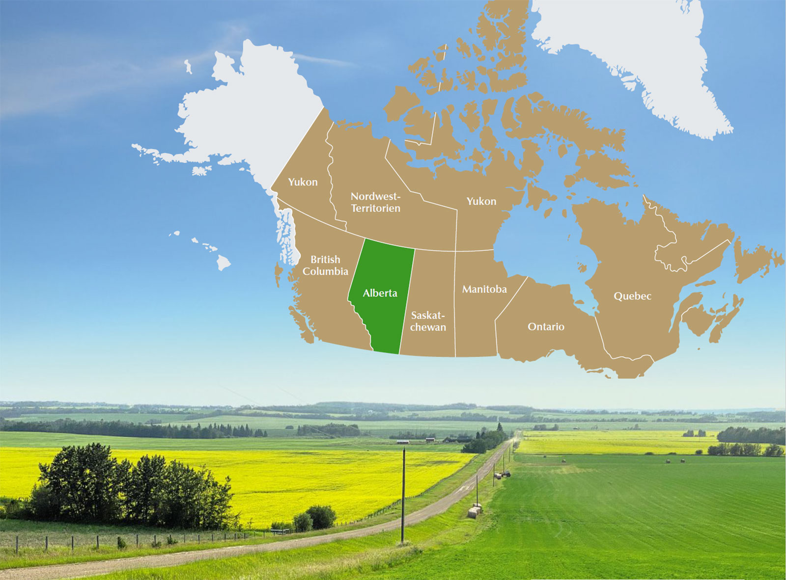 Der Bundesstaat Alberta ist nicht nur bekannt für seine Rocky Mountains sowie der florierenden Öl- und Gasindustrie. Auch ackerbaulich hat die Region großes Potential. Alberta ist nach Ontario die zweitgrößte Agrarprovinz des Landes: 41 500 Ackerbaubetriebe bewirtschaften rund 14 Mio. ha Land, besonders in den Ausläufern der großen Prärien. Wo es ausreichend regnet, dominiert der Anbau von Weizen, Raps, Hafer und Hülsenfrüchten. Im trockenen Südosten ist dagegen die Rindermast vorherrschend. Das »Feedlot alley« rund um Lethbridge gehört zu den viehintensivsten Regionen der Welt: Dort stehen auf 500 km2 2,3 Mio. Rinder. Etwa 60 % des kanadischen Rindfleischs werden dort produziert. Ein Großteil des in Alberta erzeugten Futtergetreides geht dorthin.