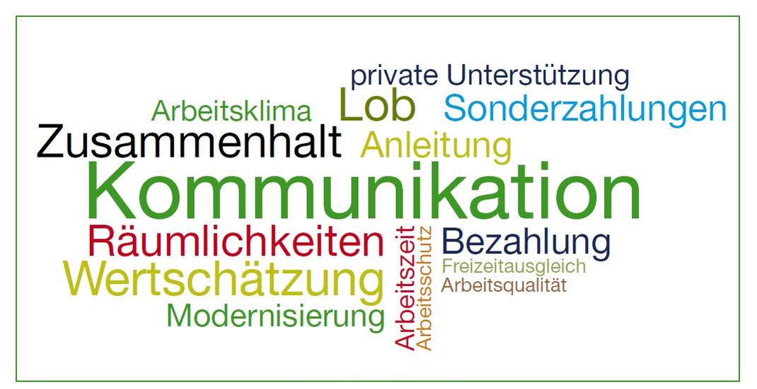 Ein weiterer wichtiger Punkt ist die Bezahlung. Neben einem angemessenen Stundenlohn bzw. einer entsprechenden Gehaltszahlung wünschen sich die Mitarbeiter Sonderzahlungen wie Urlaubs- und Weihnachtsgeld. Außerdem sollte die fachliche Qualifikation bei der Bezahlung berücksichtigt werden. Statt der Vergütung anfallender Überstunden wünschen sich die befragten Mitarbeiter einen Freizeitausgleich.