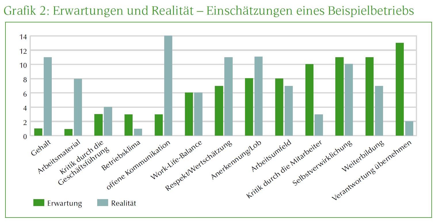 Dabei ist nicht entscheidend, wie hoch oder niedrig ein bestimmtes Thema bewertet wurde, vielmehr geht es darum, dass die Lücke zwischen Erwartungen und Realität möglichst klein ist. Sind die Balken also annähernd gleich hoch, ist dies ein Indiz dafür, dass die Mitarbeiter mit diesem Punkt zufrieden sind, da ihre Erwartungen mit der Realität übereinstimmen. Ist der »Realitäts-Balken« kleiner als