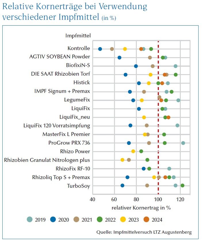 Impfung. Wie alle Leguminosen gehen auch Sojabohnen eine Symbiose mit stickstofffixierenden Knöllchenbakterien ein. Etwa 50 bis 70 % ihres Stickstoffbedarfs deckt die Sojabohne mithilfe der Rhizobien. Der spezifische Symbiosepartner Bradyrhizobium japonicum ist jedoch in europäischen Böden nicht natürlicherweise vorhanden. Daher ist eine gezielte Inokulation des Saatguts mit den Bakterien (Impfung) entscheidend für den erfolgreichen Anbau.