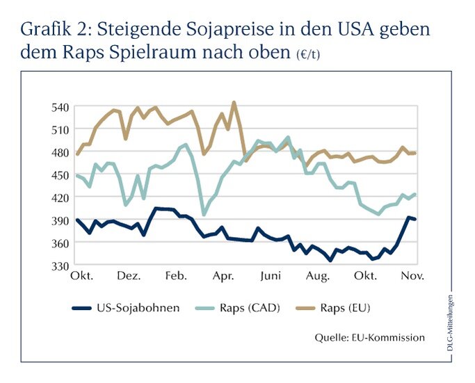 Am globalen Ölsaatenmarkt gibt aktuell die Sojabohne den Takt vor, da beißt die Maus keinen Faden ab. Vergleicht man den Verlauf der Terminmarkt-Notierungen von Sojabohne (Chicago) und Raps (Paris) von Mitte August bis Mitte November, dann findet sich jede Preisspitze und jedes Preistal der Bohne auch beim Raps wieder. Sicher, tageweise laufen die Kurse auseinander, aber der allgemein gleichlaufende Trend ist unverkennbar.