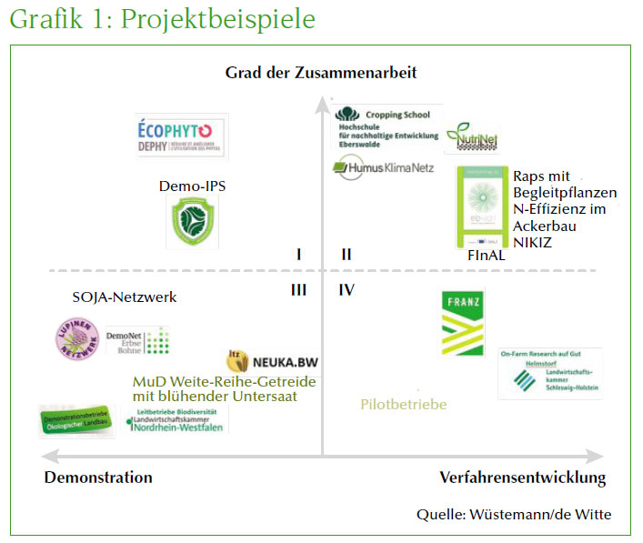 Die Intensität der Zusammenarbeit kann dabei sehr verschieden sein. Grafik 1 zeigt Beispiele für Praxisforschungsprojekte mit unterschiedlichen Schwerpunkten. Im ersten Quadranten ist beispielsweise das Projekt Demonstrationsbetriebe integrierter Pflanzenschutz (»Demo IPS«) zu finden. Ein Grad der Zusammenarbeit im mittleren Bereich ergibt sich, weil die Projektbetriebe ihre Erfahrungen miteinander diskutieren konnten. Im zweiten Quadranten sind Projekte zu finden, bei denen sowohl die Zusammenarbeit zwischen den beteiligten Betrieben als auch die Weiterentwicklung wichtig sind. So arbeiten im Projekt »Nutrinet« ökologisch wirtschaftende Betriebe daran, ihre Nährstoffe effizienter zu nutzen. Sie treffen sich regelmäßig im Rahmen des Projektes zu »Field-Schools« und legen auf ihren Flächen darüber hinaus Praxisversuche an (Seite 22). Im Quadranten unten links sind Projekte eingeordnet, die vornehmlich auf die Verfahrensdemonstration ausgerichtet sind. So wurden im Soja-Netzwerk »Best-practice«-Beispiele zum Anbau demonstriert, ohne dass es zwischen den beteiligten Betrieben einen systematischen Austausch über die eigenen Erfahrungen gab. Im vierten Quadranten steht die Verfahrensentwicklung im Fokus. Ein Beispiel hierfür ist das On-Farm-Projekt auf Gut Helmstorf in Schleswig-Holstein. Dort wurden Precision-Farming-Technologien, vor allem zur teilflächenspezifischen Bewirtschaftung, evaluiert und hinsichtlich der betriebsspezifischen Anwendung weiterentwickelt. Das Projekt wurde jedoch nur auf einem einzigen Betrieb durchgeführt, sodass ebenfalls kein systematischer Austausch zwischen verschiedenen Landwirten zustande kommen konnte.