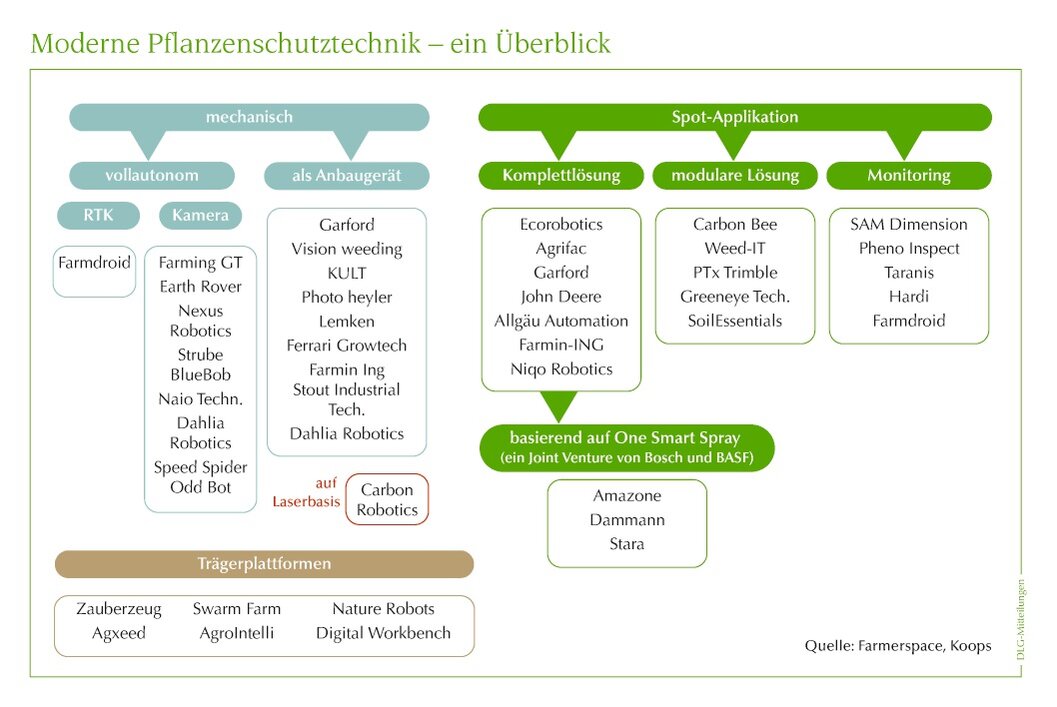Die beschriebenen Technologien werden auch bereits als vollwertig autonome Lösungen in Form von selbstfahrenden Feldrobotern angeboten. Diese verfügen über Module zur Lokalisierung, Navigation und automatisierten Erkennung der Unkräuter, das Bewegen der Aktuatoren sowie die Aktivierung der mechanischen, chemischen oder auch thermischen Wirkmethode. Diese Systeme etablieren sich gerade am Markt und sind vielfach bei Testlandwirten im Einsatz. Hingegen in der Praxis weiter verbreitet sind schleppergezogene Systeme. Hier bestimmt der Fahrer die grobe Positionierung und das System kümmert sich um die Feinpositionierung und die Aktivierung der Arbeitswerkzeuge. Diese Systeme lassen sich derzeit noch flexibler einsetzen und fügen sich besser in den Fuhrpark des Landwirts ein, weil vorhandene Maschinen genutzt und Arbeitsabläufe kaum verändert werden müssen. Ihre Handhabung ist analog zu etablierten Systemen, ihre Flächenleistung ist oftmals noch höher als die der Roboter und gesellschaftliche Hürden sind derzeit noch deutlich geringer.