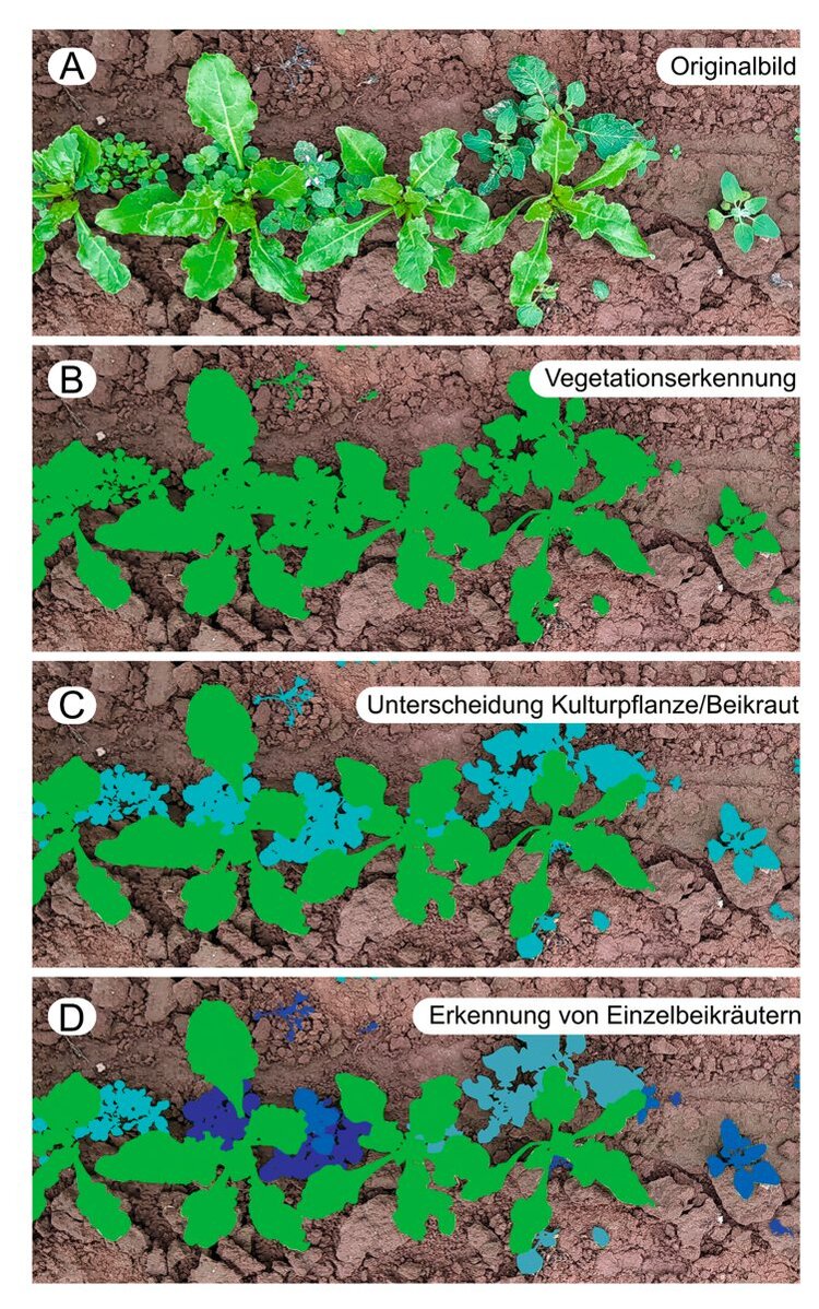 Die Interpretation der aufgenommenen Kamerabilder erfolgt durch maschinelle Lernmethoden – Künstliche Intelligenz, die gelernt hat, Kulturpflanzen von Unkräutern zu unterscheiden (Bild rechts) und zunehmend auch verschiedene Unkräuter voneinander unterscheiden kann. Dazu wurden der KI sehr viele unterschiedliche Ansichten dieser Objekte gezeigt, sodass sie diese Unterscheidung heute akkurat beherrscht und sie bereits in praxistauglichen Geräten implementiert ist. Intelligente Algorithmen sind inzwischen in der Lage, fast jedes Unkraut zu erkennen, selbst wenn es erst kurz zuvor aufgelaufen ist. Eine Herausforderung besteht hingegen noch darin, Ungräser wie Ackerfuchsschwanz von Getreidepflanzen zu unterscheiden, weil deren Merkmale im frühen Entwicklungsstadium sehr ähnlich sind. Hier ist noch einige Entwicklungsarbeit nötigt.