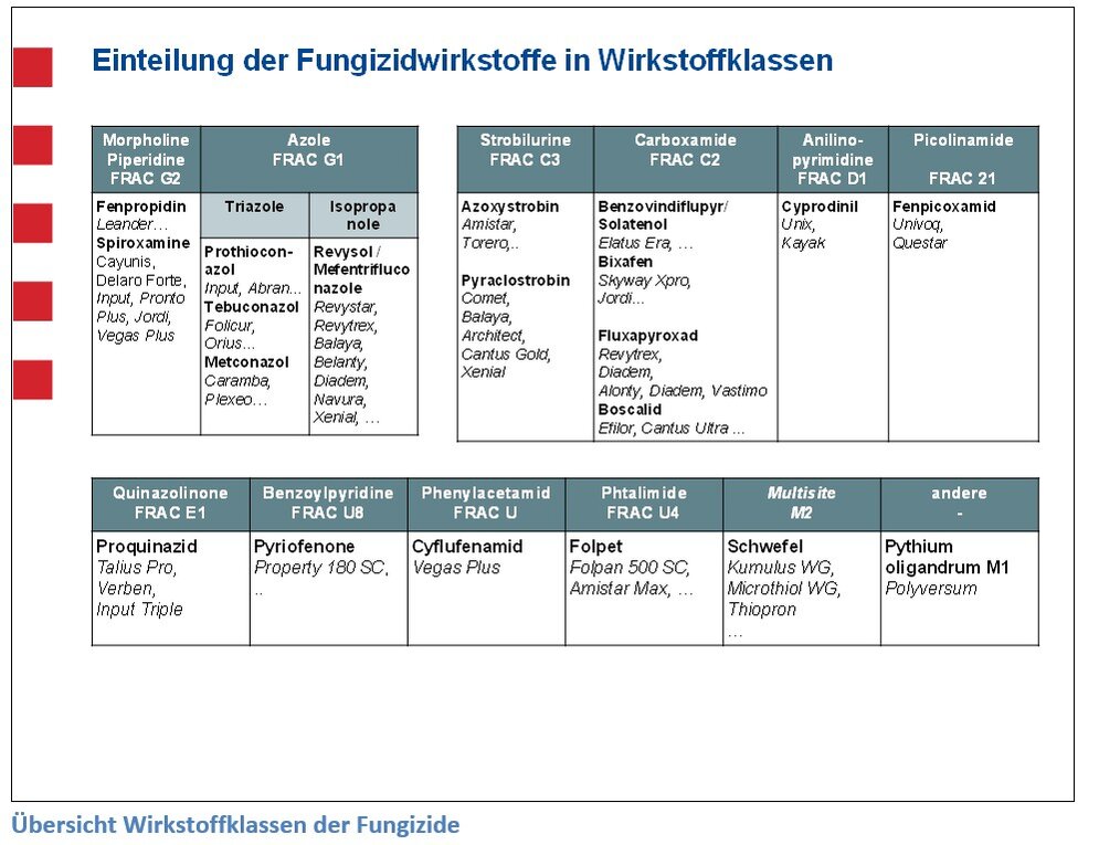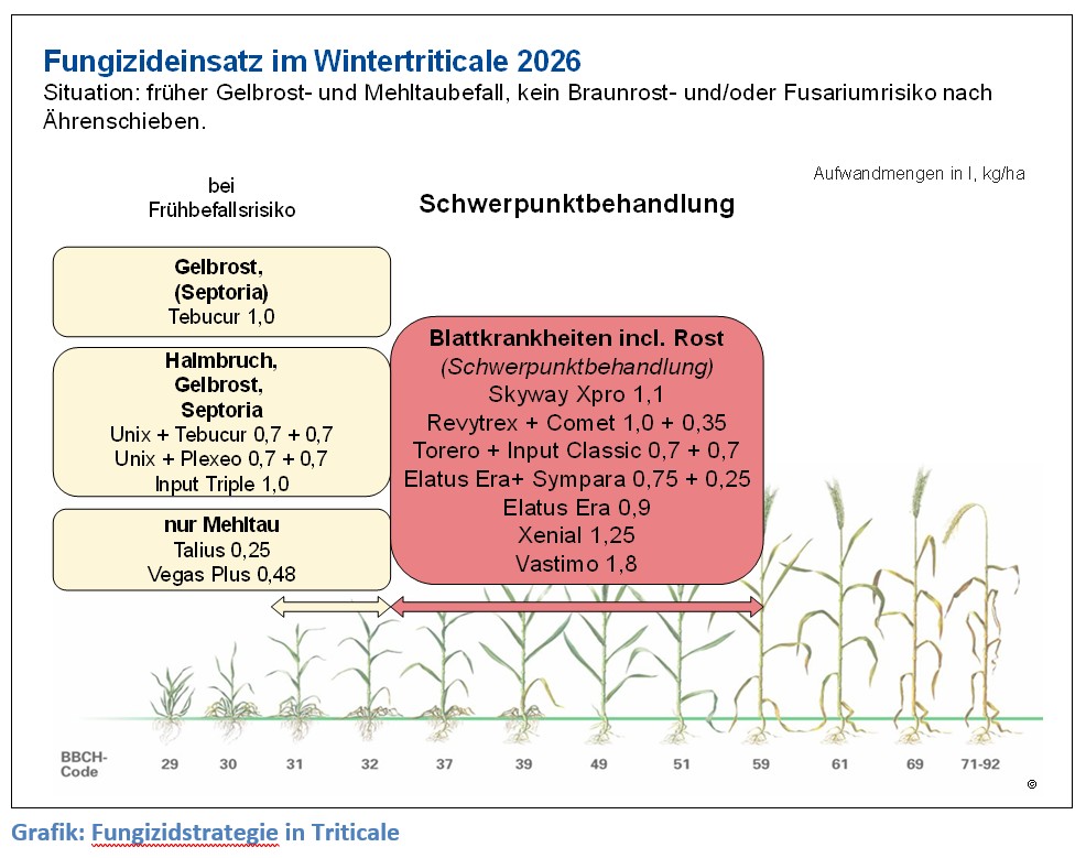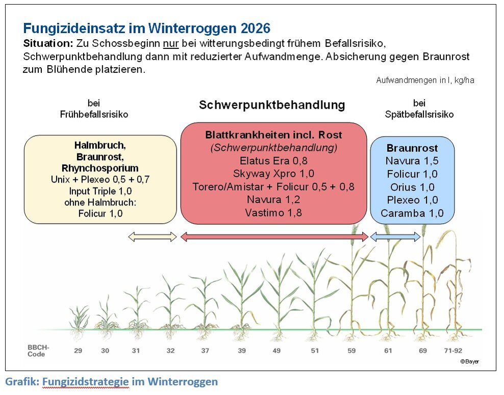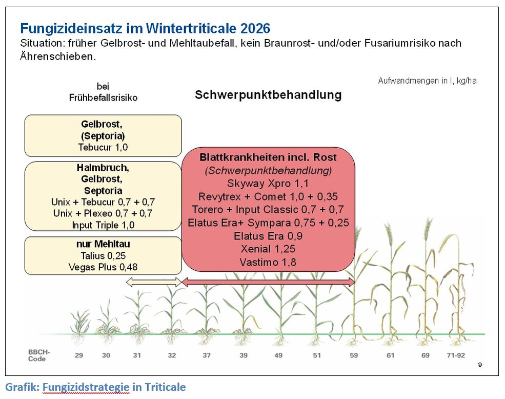 Aktuelle Zulassungssituation von Fungiziden und interessante neue Produkte. Bei der erneuten Zulassung bzw. Bewertung alter Wirkstoffe führten schärfere Kriterien zu einer Reduzierung vieler Fungizidwirkstoffe. 2026 neu hinzukommen wird das Produkt Cayunis Xpro Set (Cayunis + Siltra Xpro) mit den Wirkstoffen Bixafen, Spiroxamine, Prothioconazol und Trifloxystrobin. Wegen des Trifloxystrobins, das bei Netzflecken in der Gerste noch voll wirksam ist, bietet sich diese Mischung in der Gerste und vielleicht auch im Roggen an.