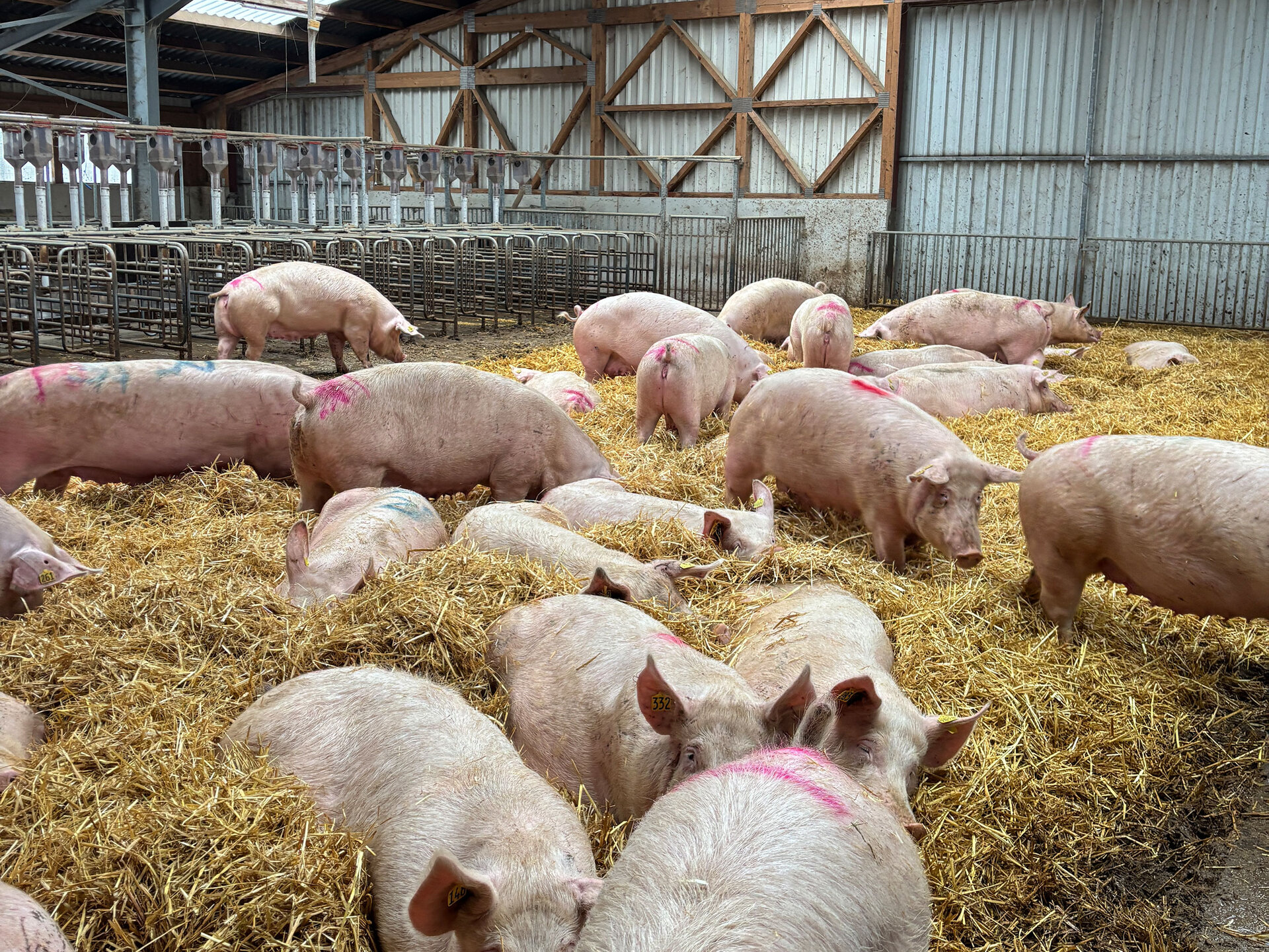 Der Strohbedarf liegt bei etwa 220 Rundballen pro Jahr, vorzugsweise Gerstenstroh. Eingestreut wird alle zehn Tage mit sechs bis acht Ballen. In der Zeit der Rangkämpfe (bis 48 Stunden nach der Einstallung ins Deckzentrum) dienen sie als Rückzugsmöglichkeit für rangniedrigere Tiere. Das Ausmisten erfolgt alle zehn Wochen (in jeder zweiten Gruppe nach dem Besamen) per Teleskoplader. Jährlich fallen 350 t Mist an (5 t/Platz).