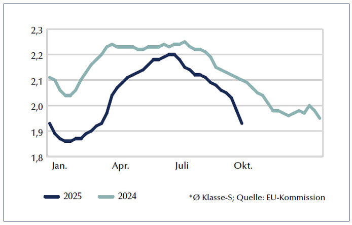 Im Gegensatz zum vorangegangenen Report steht für 2025 im Jahresvergleich statt eines Rückgangs nun ein Anstieg um annähernd 2 % auf 21,6 Mio. t in Aussicht. Auf diesem Niveau soll sich das Binnenaufkommen im neuen Jahr stabilisieren, wobei weiter steigende Schlachtgewichte die um 1 Million Tiere (entsprechend 0,6 %) rückläufigen Schlachtungen ausgleichen sollen. Beim ersten Blick auf das kommende Jahr zeigt sich damit kein Spielraum für weiteres Wachstum, und die aktuellen Entwicklungen stützen diese Annahme.