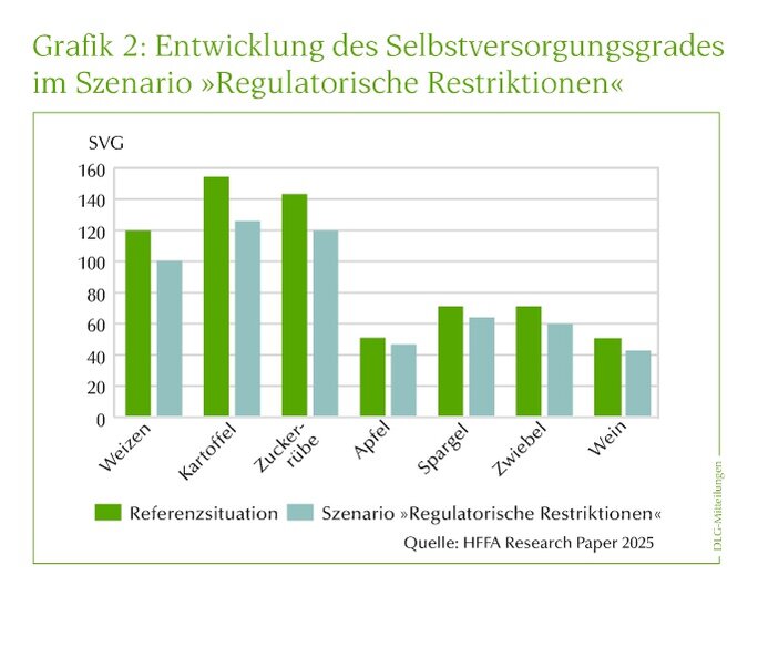 Die HFFA-Studie modelliert, wie sich Klimawandel und der Wegfall von Pflanzenschutzwirkstoffen auf die landwirtschaftliche Produktion auswirken. Grundlage sind historische Ertragsdaten, Wettertrends, Bodeneigenschaften und Bewirtschaftungsdaten, die in Szenarien fortgeschrieben werden. Verglichen werden eine »Referenzsituation« (heutiger Stand) und eine »Szenariosituation« mit verschärften Klimabedingungen und geringerer Wirkstoffverfügbarkeit. Der zentrale Indikator ist der Selbstversorgungsgrad (SVG) als Maß für die Fähigkeit der heimischen Nahrungsmittelproduktion die eigene Nachfrage zu decken.
