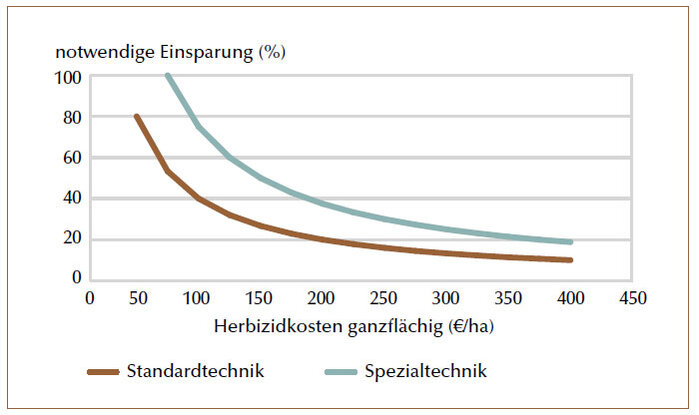 Um bei der einmaligen Unkrautbekämpfung im Mais mittels Spot-Spraying ökonomische Vorteile zu erzielen, müssen sehr hohe Einsparpotentiale erreicht werden, die bei praxisüblicher Verunkrautung kaum zu schaffen sind. In Zuckerrüben hingegen sind wegen der in der Regel dreiteiligen Spritzfolge schon geringere Reduktionen ausreichend für eine ökonomische Vorzüglichkeit. Bei Einsatz der Spezialgeräte sind die eingesparten Kosten für die nicht benötigte Standardspritze (15 €/ha je Überfahrt) berücksichtigt.