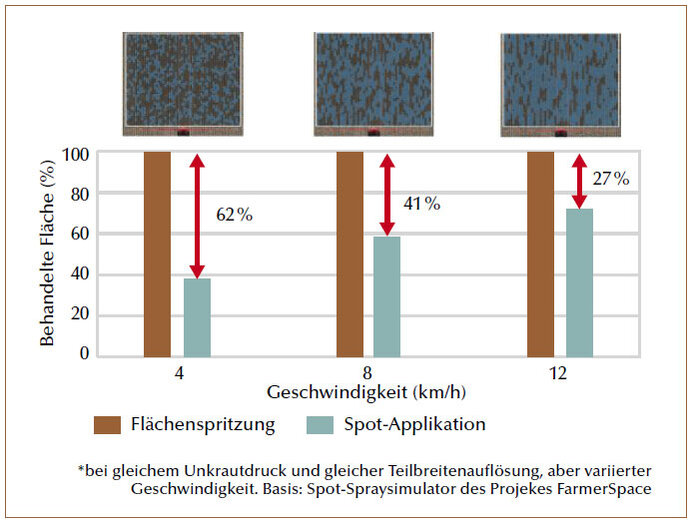 Die Einsparpotentiale hängen neben den bereits diskutierten technischen Gegebenheiten der Teilbreitenschaltung oder Düsenschaltzeiten sowie der Geschwindigkeit vor allem auch von der vorhandenen Unkrautdichte ab. Je mehr Unkräuter vorliegen und je gleichmäßiger diese verteilt sind, desto mehr Fläche muss behandelt werden und desto schneller wird aus der Spot-Behandlung eine vollflächige Applikation. Eine gute Kalkulationshilfe bietet hierbei der im Projekt FarmerSpace entwickelte Spot-Applikation Simulator.