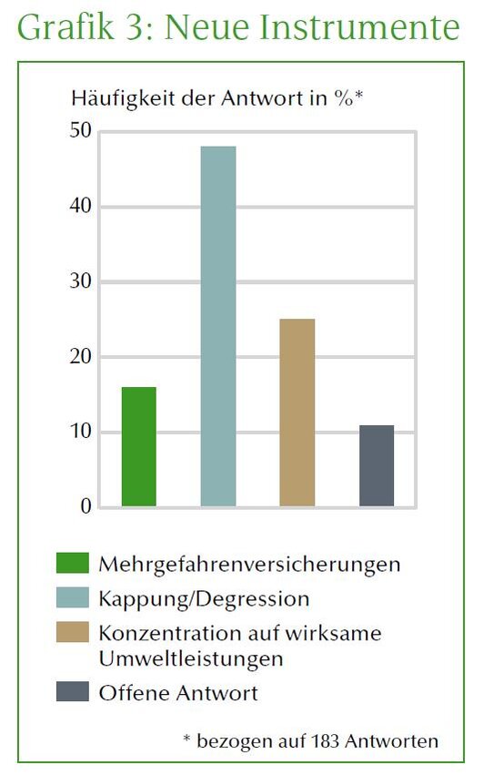 Über welches Instrument solle/müsste sich die GAP mehr Gedanken machen, wenn das Budget doch nicht für alle Wünsche reicht? Mit dieser Frage wollten wir Sie etwas aus der Reserve locken. Aber uns hat schon erstaunt, wie eindeutig (mit 48 %) Kappung und Degression ins Spiel gebracht wurden (Grafik 3). Ebenfalls 48 % der Antworten kam allerdings aus Betrieben unter 100 ha. Es scheint ein großes