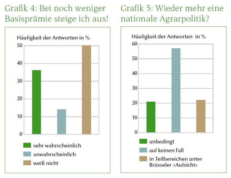 50 % sind sich unsicher (Grafik 4). Konnte man die Ausstiegs-Ansagen der Vergangenheit noch als »Stammtisch« werten, so scheinen sie langsam zur rational kalkulierten Option zu werden. Wenn die GAP statt der Flächenprämien nur noch (oder weitgehend) öffentliche