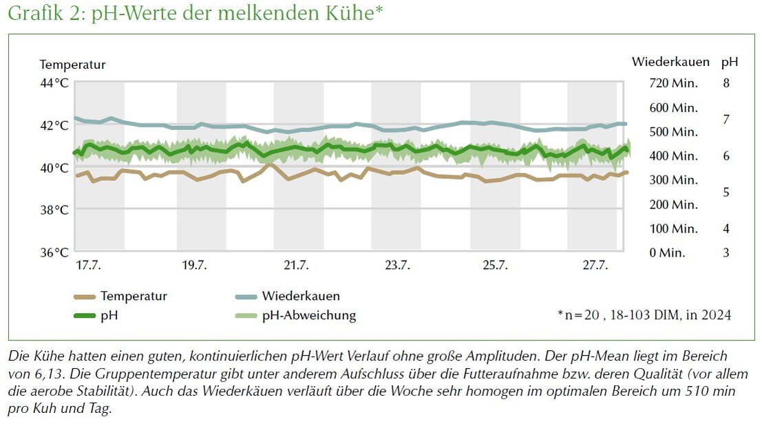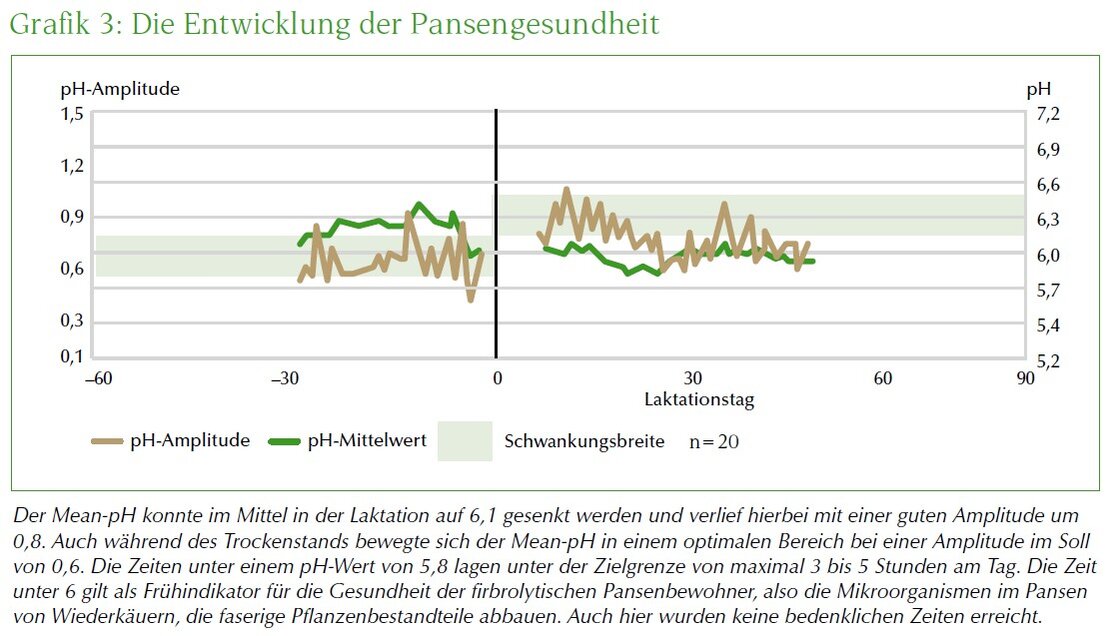 Besonders wichtig ist die kontinuierlichen Überwachung des pH-Wertes im Netzmagen, da er maßgeblich die Fermentationsbedingungen beeinflusst und somit eine zentrale Rolle bei der Methanbildung spielt. Auf dem Betrieb Jünck führten die Optimierung der Grassilage und die Verbesserung der Verdaulichkeit der NDF (Gerüstsubstanzen, pflanzliche Kohlenhydrate) zu vielversprechenden Ergebnissen. Denn dort konnte der mittlere pH-Wert in der Leistungsphase von 6,4 bis 6,5 auf konstant 6,1 reduziert werden. Damit ließ sich das hohe Produktionsniveau des Milchviehbetriebes über die gesamte Fütterungsphase hinweg bei gleichbleibender Milchqualität (3,95 % Fett, 3,45 % Eiweiß) um bis zu 9 % steigern.