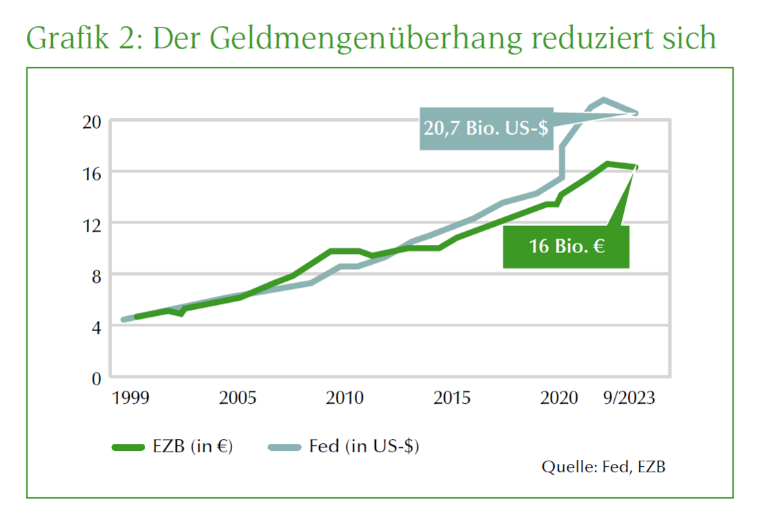 Sinkende Geldmenge. Bei der Diskussion über Inflation und Zinsen ist das Augenmerk auch auf die im Umlauf befindliche Geldmenge (M3) zu richten. Diese ist in der Nullzinsphase durch den Kauf von Staats- und Firmenanleihen durch die Zentralbanken drastisch angestiegen (siehe Grafik 2). Nun zeigt sie wieder einen Rückgang. Der Übergang in die Normalität von Geldwertstabilität bei niedrigen Zinsen ist eingeläutet und könnte Finanzmärkte und Realwirtschaft in gleicher Weise stimulieren.