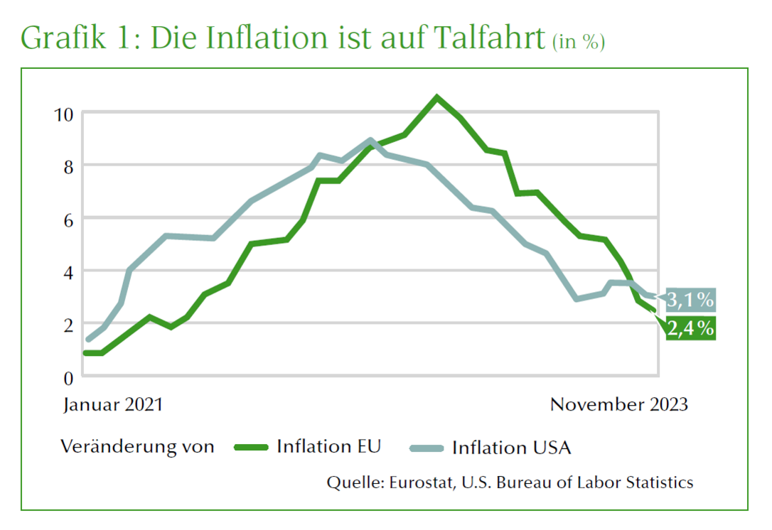 Inflation flaut ab. Nach einer beeindruckenden Rallye der Inflation sind die Preise inzwischen wieder fast auf dem Niveau vor der Pandemie angekommen. Im November ist die Teuerung auf 2,4 % gefallen (Grafik 1), während vor einem Jahr noch zweistellige Werte gemessen wurden. Damit wird ein Großteil der Spannung aus den Finanzmärkten herausgenommen. Und auch die Inflationserwartungen lassen die Märkte optimistisch in die Zukunft schauen, weil sich die Energiepreise (Gas – 64 %, Strom – 53 % im Jahresvergleich) beruhigen.