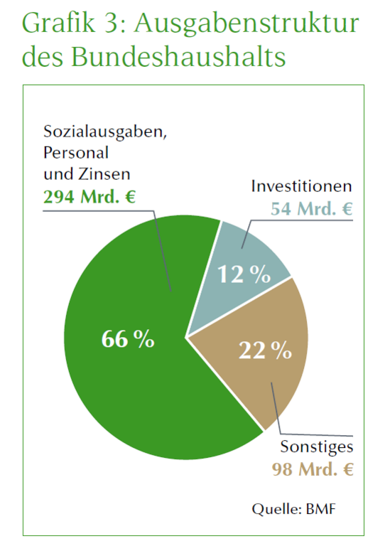 Nahezu nirgendwo auf der Welt ist der Sozialstaat größer als in Deutschland. Der Anteil der öffentlichen Sozialausgaben am Bruttoinlandsprodukt liegt bei satten 27 %. Und trotz hoher Steuer- und Abgabenquote lebt das Land von der Substanz. Beispielsweise sind die jährlichen Investitionen in die öffentliche Infrastruktur im Vergleich zu anderen europäischen Industrienationen mit 2,6 % weit unter dem Durchschnitt.