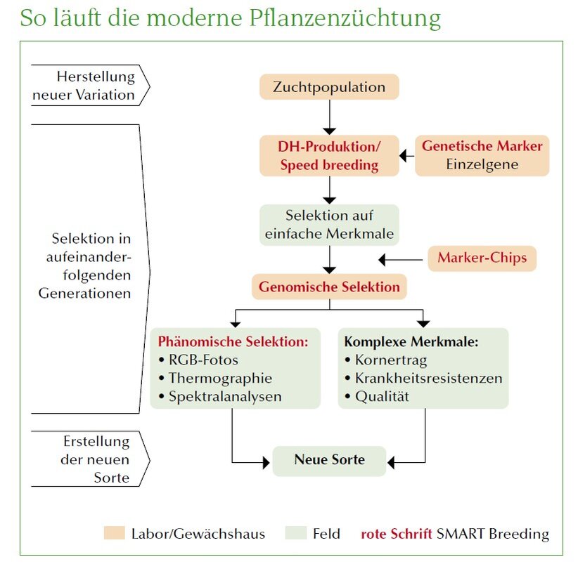 Bei Sommerkulturen ist das sogenannte Speed Breeding besonders effizient. Dabei wird durch technische Tricks (Beleuchtung, Temperatur, Tageslänge) die Pflanzenentwicklung enorm beschleunigt. Dabei entstehen zwar nur ganz wenige Samen, diese genügen aber für die Fortführung. So können bei Sojabohnen in einem Jahr fünf bis sechs Generationen erzielt werden. Die Pflanzen sind nach der Kreuzung dann schon nach einem Jahr weitgehend homozygot. Dabei kann man bereits in diesem Stadium mit genetischen Markern auf wichtige Einzelgene selektieren, die etwa Blühzeit und Wuchshöhe bestimmen, oder auf monogenisch vererbte Krankheitsresistenzen. Marker sind DNS-Abschnitte, deren Lage im Genom bekannt ist, die mit molekularen Techniken leicht zu erkennen sind und in Zusammenhang mit erwünschten Merkmalen stehen. Kennt man beispielsweise einen eng koppelnden Marker für eine monogenische Rostresistenz, kann man diesen nutzen, um bereits im Keimlingsstadium die resistenten Nachkommen einer Kreuzung im Labor anhand dieses Markers auszusuchen (= markergestützte Selektion). Trotzdem muss natürlich anschließend mehrortig auf die jeweils wichtigen anderen Merkmale (Zuchtziele) im Feld selektiert werden (Grafik). Dabei führt man zunächst eine Selektion auf einfache Merkmale, also solche mit hoher Erblichkeit, durch (z. B. Blüh-/ Reifezeit, Wuchshöhe, bestimmte Krankheitsresistenzen, TKG). Dadurch wird die Zuchtpopulation eingeschränkt und die vorhergehende Markerselektion im Feld verifiziert. Anschließend werden die selektierten Genotypen im Labor mit Markerchips, die Zehntausende genomweit verteilte Marker enthalten, analysiert und mit Computermodellen eine genomische Selektion durchgeführt. Dabei selektiert man gleichzeitig auf alle Zuchtziele mit allen vorhandenen Markern, um die Nachkommen mit den jeweils besten Kombinationen herauszufiltern. Auch diese Selektion kann nach einigen Vorarbeiten (»Trainingspopulation«) im Labor stattfinden. Die genomische Selektion ist besonders bei Merkmalen geeignet, bei denen viele Gene wie die Instrumente in einem Orchester zusammenspielen – etwa bei Kornertrag, komplex vererbten Krankheitsresistenzen oder vielen Qualitätsmerkmalen.