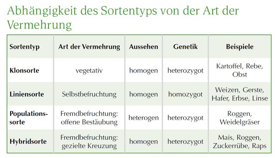 Bei Selbstbefruchtern kommt es nach der Kreuzung automatisch zur Selbstung. Dadurch werden die Pflanzen in jeder Generation homogener und homozygoter (reinerbig), wobei am Ende eine reine Linie steht. Bei der Fremdbefruchtung gibt es im Wesentlichen zwei Möglichkeiten. Die Vermehrung durch offene Bestäubung vorselektierter Familien ergibt eine Populationssorte mit heterogenen, heterozygoten Einzelpflanzen. Die gezielte Kreuzung zweier Inzuchtlinen führt zu einer homogenen Hybridsorte; die Einzelpflanzen sind heterozygot. Bei allen Sortentypen, außer der Hybridsorte, führt der Nachbau zu genetisch identischen Nachkommen.