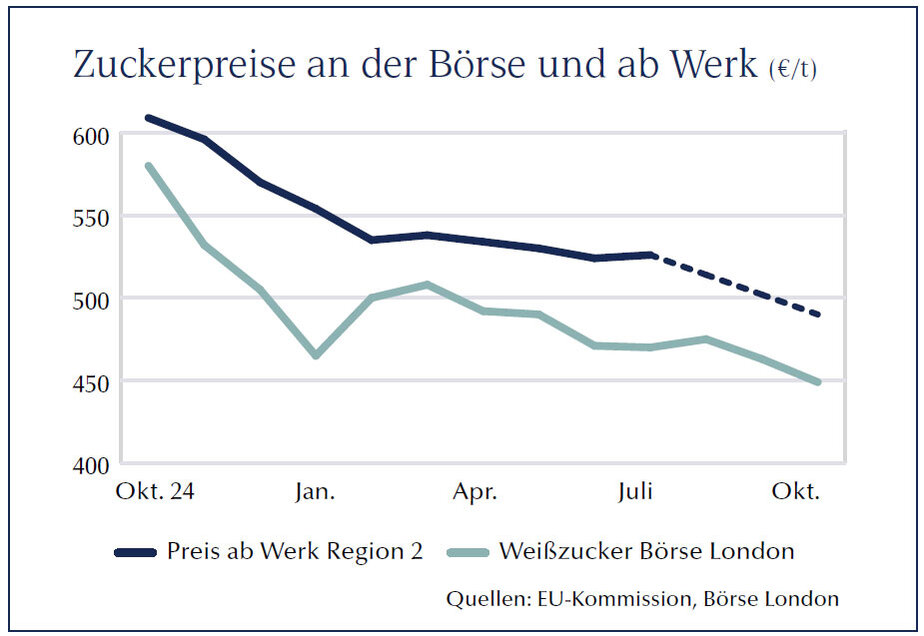 Am Ende entscheidend ist für deutsche Rübenanbauer der Zuckerpreis ab Fabriktor. Der lag 2023 in der Spitze bei 1 100 €/t. In den vergangenen Monaten lag er noch relativ stabil bei 550 bis 570 €/t. Kurz vor Beginn der neuen Rübenkampagne schmierte der Preis auf 490 €/t ab. Hintergrund war der größer als sonst übliche Abgabedruck aller Fabriken im Herbst. Nordzucker etwa mietete ein Terminal im Hafen, um die Silos in den Fabriken frei zu machen für die neue Ernte. Dieser Druck ist zwar jetzt vorbei, aber die Preismarke ist gesetzt.