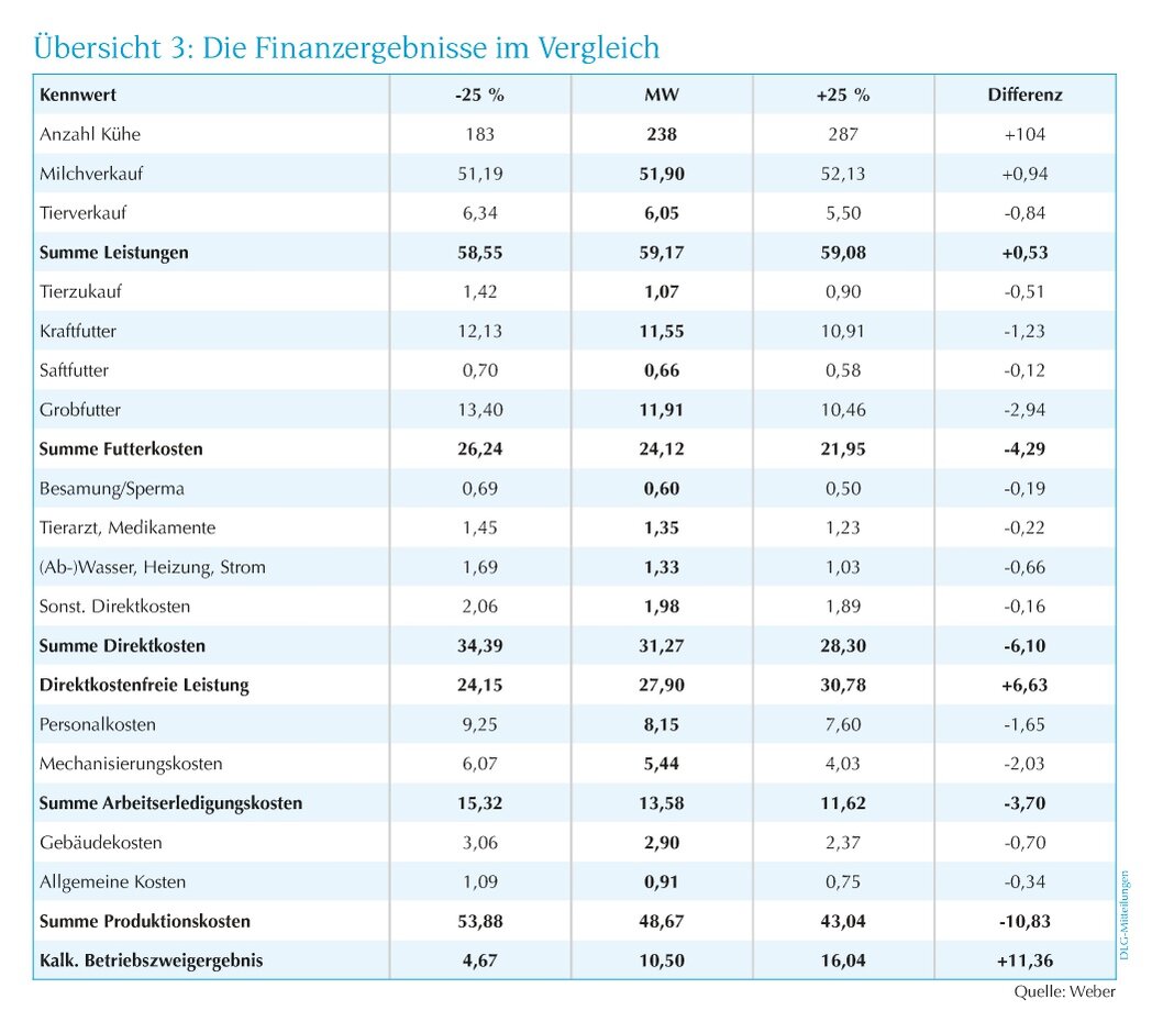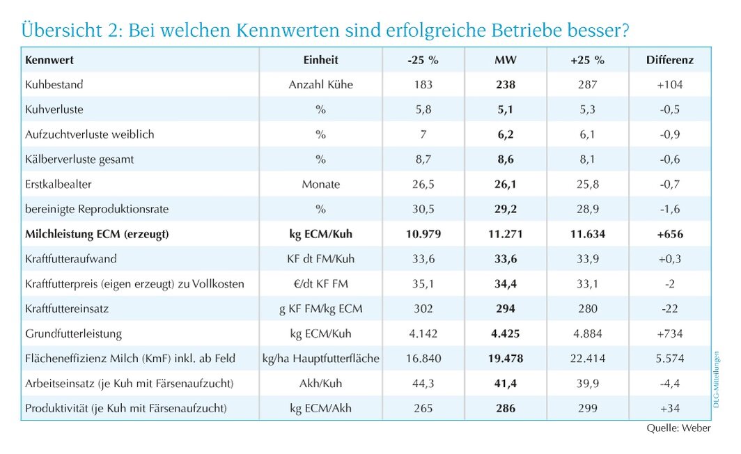 Nicht allein die Marktleistung macht‘s, sondern eine effiziente Produktion. Betrachtet man die Ergebnisse über alle Betriebe sortiert nach kalk. BZE, fällt eine geringe Leistungsdifferenz von 656 kg ECM zwischen den wirtschaftlich unterschiedlich erfolgreichen Gruppen auf. Die von fast allen Betrieben übertroffenen 11 t durchschnittliche Milchleistung bei insgesamt guten bis sehr guten Produktionskennwerten bei Tierverlusten, Jungviehaufzucht und Reproduktion zeigen, dass es primär nicht mehr auf die absolute Leistungsmaximierung ankommt, sondern auf eine möglichst effiziente Produktion. Deutlich ist jedoch zu erkennen, dass die 25 % wirtschaftlich erfolgreichsten Betriebe mit im Schnitt 287 Kühen die größeren Bestände haben. In fast allen Produktionskennziffern werden die größeren Herdenstrukturen tendenziell effektiver gemanagt. Trotz des insgesamt hohen Produktionsniveaus erzielen sie eine bessere Futterverwertung. Das gilt auch für die Verwertung der betriebsindividuellen Faktorausstattung. Bei hohen Markterlösen kann natürlich durch hohe Milchleistungen der Gewinn je Kuh deutlich maximiert werden. Drastische Markteinbrüche, wie aktuell, können dies ins Gegenteil verkehren, wenn die Produktionsschwelle nicht erreicht wird (Übersicht 2).