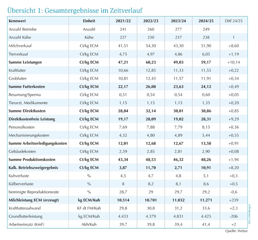 Mit durchschnittlich 10,91 Ct/kg ECM kalkulatorischem Betriebszweigergebnis (kalk. BZE) lieferten die DLG-Spitzenbetriebe im Wirtschaftsjahr 2024/25 ein ähnlich gutes Ergebnis wie 2022/23. Sie stammen aus ganz Deutschland und stellen als Spitzenbetriebe der jeweiligen Region die Daten ihrer Betriebszweigauswertung auf Vollkostenbasis für den Vergleich zur Verfügung. Aus neun Bundesländern wurden 249 Betriebe unterschiedlichster Gesellschaftsformen und Faktorausstattungen berücksichtigt. Davon halten 188 Betriebe Kühe der Rasse Schwarzbunt, 36 melken Fleckviehkühe. Im Mittel stiegen die Leistungen aus dem Milchverkauf auf 51,9 Ct/kg ECM