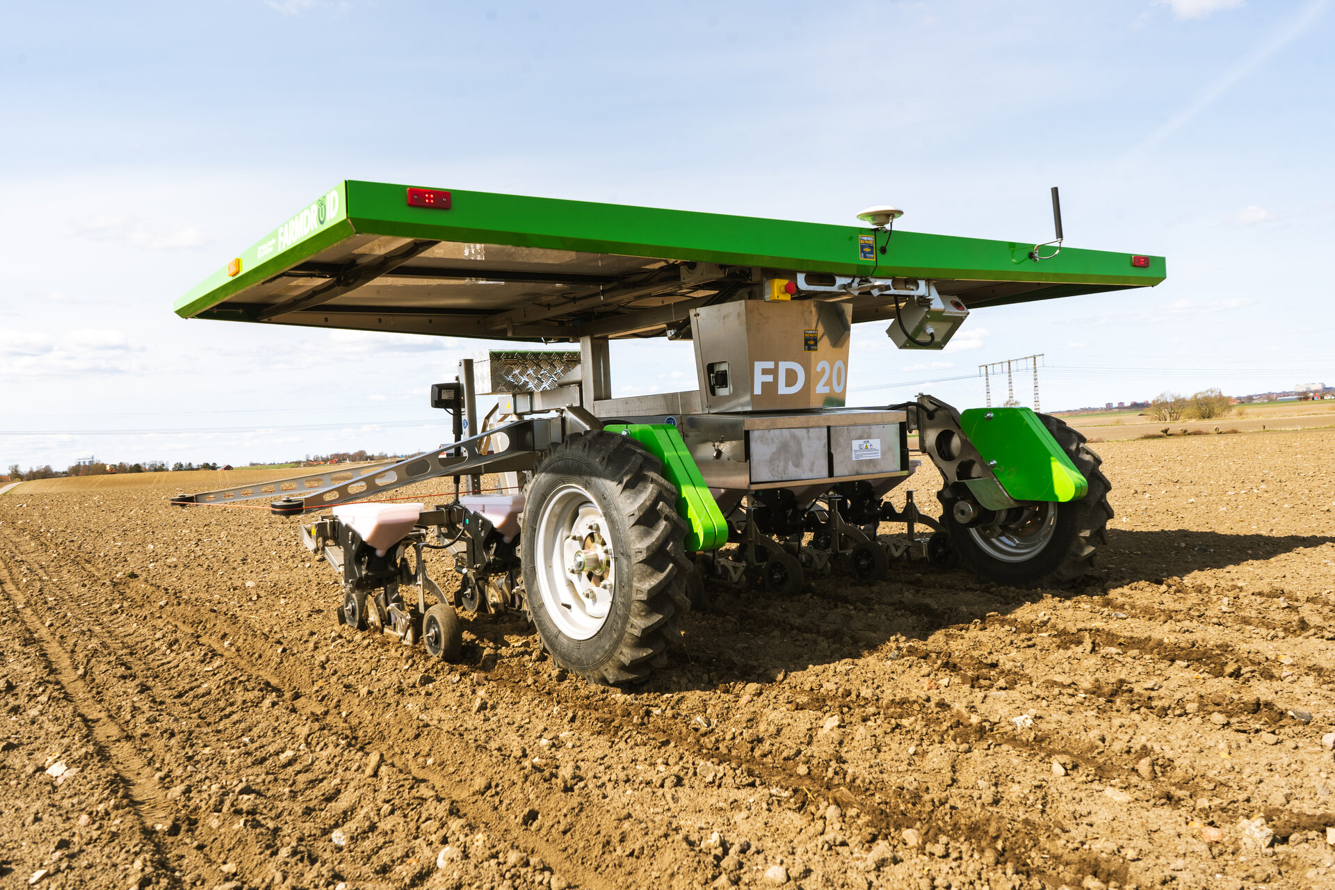 Der FarmDroid FD20 aus Dänemark ist ein solarbetriebener Feldroboter, der als Plattform sowohl Arbeitswerkzeuge fürs Hacken zwischen und innerhalb der Reihen, die Präzisionsaussaat als auch die Punkt- und Bandspritzung bedient. Auf der Agritechnica präsentierte FarmDroid sein neues nachrüstbares Aussaatsystem +Seed 14 mm für größere Samen. Damit soll sich der Roboter jetzt auch für die Aussaat von Mais, Soja, Zwiebeln, Ackerbohnen und Erbsen einsetzen lassen und schneller arbeiten (+20%).